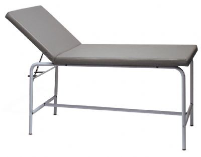 Letto da visita con struttura in tubo tondo, verniciato bianco con polveri epossidiche, provvisto di alzatesta elevabile e regolabile; ha uno snodo e due sezioni, rivestito in morbido sky. L’imbottitura è così composta: base in legno truciolare, spugna in heliocell di densità 25kg/mc di spessore di 4 cm. È fornito smontato e imballato.