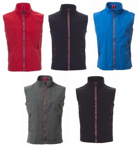 Gilet da uomo, zip da 8 mm a contrasto, due tasche esterne con zip coperta. Interno: non imbottito, retinato, una tasca con cerniera e predisposizione per cuffie e cavo smartphone zip al petto e sul fondo per agevolare stampe e ricami.