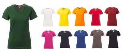 T-shirt collo a V manica corta sfiancata da donna, colletto in costina misto spandex da 1,5 cm con cucitura ribatutta sul davanti, nastro di rinforzo da spalla a spalla in colore a contrasto visibile nel colletto, cuciture stretch, cucita lateralmente.