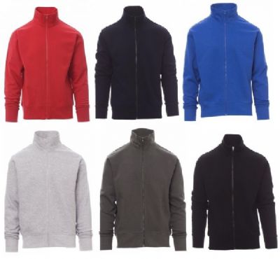 Felpa da uomo, a zip intera in plastica in tinta con cursore singolo in metallo, manica a giro, polsini e vita in costina elasticizzata, cuciture rinforzate, nastro di rinforzo interno collo in tinta.