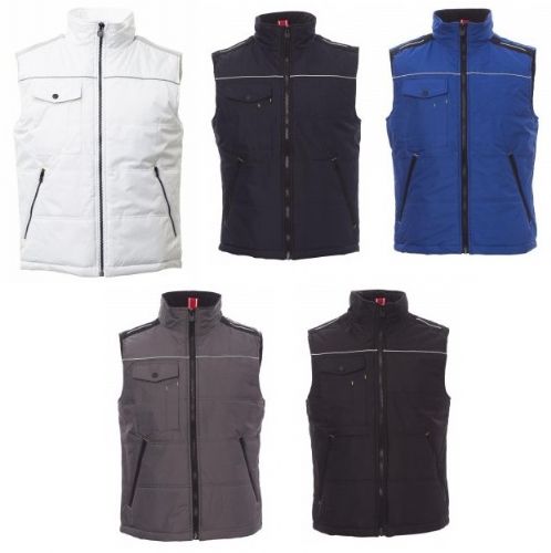 Gilet unisex, zip 8 mm in plastica con cursore in metallo, retro sagomato, due ampie tasche esterne con zip, ampia tasca al petto porta smartphone, anello porta badge, piping reflex al petto e sulla schiena. Interno: imbottitura trapuntata e rifinita con fodera ad alta densità, interno colletto in pile, una tasca.