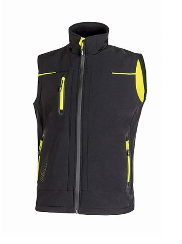 Gilet in Softshell con membrana U-Tex che rende il tessuto impermeabile, traspirante e antivento. Molto comodo e resistente con una fodera interna in morbido micro-fleece fluo e chiusura centrale con zip impermeabile. Dotato di due tasche frontali chiuse con zip fluo e coulisse antimpigliamento regolabile all’interno. Una tasca porta cellulare sul petto con tecnologia Free Sound chiusa con zip fluo. Due ampie tasche interne. Fondo sagomato. Nastro reflex su colletto nella parte posteriore. Logo U-Power tono su tono.