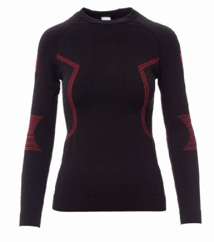Maglia termica da donna, girocollo, maniche lunghe raglan. Tessuto morbido ed elasticizzato, con speciali tramature sul petto e sulla schiena, motivi ad elica in rilievo sui fianchi, per garantire una corretta traspirazione ed una costante termoregolazione. Collo, fondo e orli maniche a costine dello stesso materiale, per un miglior comfort.