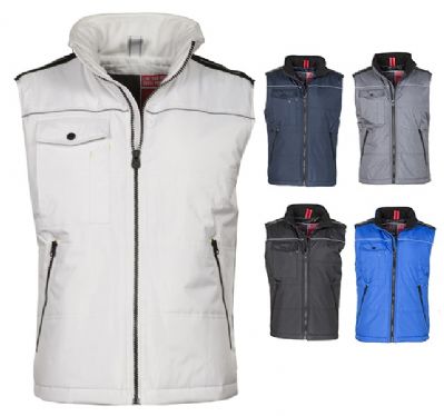 Gilet unisex, zip 8 mm in plastica con cursore in metallo, retro sagomato, due ampie tasche esterne con zip, ampia tasca al petto porta smartphone, anello porta badge, piping reflex al petto e sulla schiena. Interno: imbottitura trapuntata e rifinita con fodera ad alta densità, interno colletto in pile, una tasca.