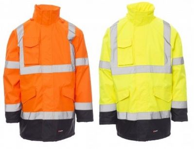 Parka fisso bicolore in alta visibilità con bande riflettenti, zip intera con patta, cappuccio richiudibile nel colletto, polsini in RIB elasticizzato, due tasche frontalicon patta, un portacellulare e anello di aggancio per porta badge. Interno: imbottito, una tasca interna con velcro, cuciture termonastrate.