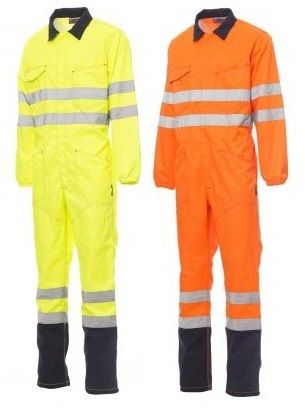 Tuta alta visibilità con bande riflettenti, cerniera centrale coperta a doppio cursore,elastico in vita sul retro. Triple cuciture di rinforzo nel cavallo ed interno gamba. Due ampie tasche applicate, due tasche al petto di cui una chiusa con patta e anello di aggancio per porta badge, un portapenne, una tasca posteriore con patta, portametro laterale destro. Polsini con elastici.