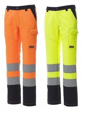 Pantalone donna, multistagione, in alta visibilità con bande riflettenti, elastici laterali e passanti in vita, chiusura con zip e bottone in plastica, due tasche anteriori a taglio classico, tasca laterale LOCK SYSTEM, porta metro, due tasche posteriori una aperta e una con patta e velcro. Cuciture a contrasto, cavallo e interno gamba a triplo ago.