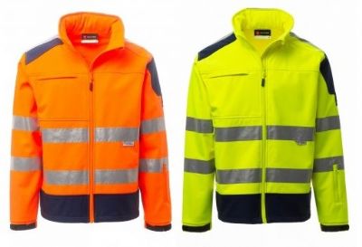 Giacca ergonomica da uomo bicolore in alta visibilità con bande 3M, zip lunga SBS nastrata, polsini regolabili con stringi polso in velcro, con cappuccio a scomparsa, due tasche laterali con zip, una tasca al petto, porta badge staccabile e richiudibile e una tasca al braccio sinistro.