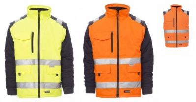 Giubbotto bicolore in alta visibilità con bande retroriflettenti, apertura chiusa da zip in plastica con cursore in metallo, maniche a giro staccabili, polsini elasticizzati, due tasche frontali con patta e velcro, una tasca al petto con patta e velcro, porta badge a scomparsa e porta cellulare e zip laterale a contrasto. Interno imbottito non rimovibile, con colletto in pile e una tasca interna.