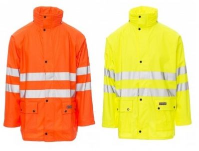 Giacca antipioggia in alta visibilità con bande 3M. Collo alto, cappuccio con coulisse a scomparsa nel colletto, maniche raglan, fondo manica dritto con polsino elasticizzato interno. Chiusura con zip in nylon e patta con bottoni automatici scoperti. Due tasche applicate ai fianchi, coperte da patta con bottoni automatici scoperti. Coulisse sul fondo. Bande e cuciture termosaldate. Progettato interamente in tessuto fluorescente con due bande retroriflettenti, che circondano il torace e le braccia.