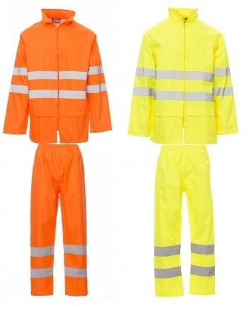 Completo antipioggia, con spalmatura in PU, composto da giacca con zip, cappuccio richiudibile nel colletto, coulisse sul fondo, fondo manica dritto regolabile con bottone a pressione, retinatura interna sulla schiena, due tasche frontali con patta di chiusura. Pantalone con elastico in vita e due aperture laterali in corrispondenza delle tasche, fondo regolabile con bottone a pressione. Con bande riflettenti su giacca e pantalone. Cuciture termonastrate. Completo imbustato in un sacchetto chiuso da zip.
