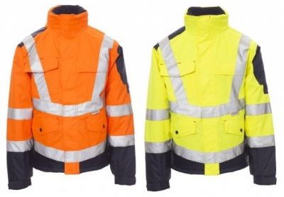 Giubbotto bicolore in alta visibilità con bande retroriflettenti, apertura con zip in plastica con cursore in metallo coperta da patta e velcro, cappuccio con coulisse sagomato e/o richiudibile nel colletto, polsini regolabili. 4 tasche frontali con patta: petto destro con velcro, porta penne e porta badge a scomparsa; lato cuore con zip nascosta; 2 inferiori con apertura superiore con zip e bottone a pressione e apertura laterale. Interno imbottito non rimovibile, con colletto e spalle in micropile, zip sul fondo posteriore per agevolare stampe e ricami, con due bande che circondano il torace, le spalle e le maniche. Cuciture termonastrate.