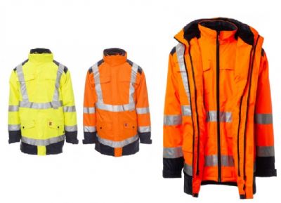 Parka bicolore 4in1 in alta visibilità con bande riflettenti. Giacca esterna sfoderata, apertura con zip in plastica con cursore in metallo coperta da patta e velcro, cappuccio con coulisse staccabile e/o richiudibile nel colletto, polsini regolabili elasticizzati. 4 tasche frontali: petto destro con velcro, porta penne e porta badge a scomparsa; lato cuore con zip; 2 inferiori con zip e bottone a pressione e apertura laterale. Cuciture termonastrate. Giubbotto interno imbottito con maniche staccabili, zip in plastica con cursore in metallo, polsino elasticizzato. 4 tasche frontali: petto sinistro con velcro, porta penne e porta badge a scomparsa; lato cuore con zip; 2 inferiori con velcro. Su entrambi: colletto e spalle in micropile, zip per agevolare stampe e ricami, due bande su torace, spalle e maniche.
