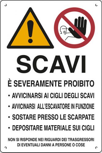 Cartello in polionda cm 60x40 SCAVI È SEVERAMENTE PROIBITO -AVVICINARSI AI CIGLI DEGLI SCAVI -AVVICINARSI ALL'ESCAVATORE IN FUNZIONE Unità di misura: pz | Peso: 100 gr