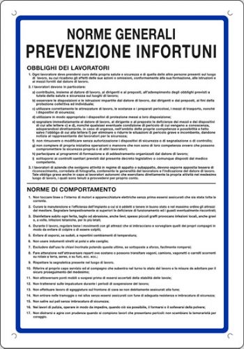 Cartello in polionda cm 60x40 NORME GENERALI PREVENZIONE INFORTUNI OBBLIGHI DEI LAVORATORI NORME DI COMPORTAMENTO